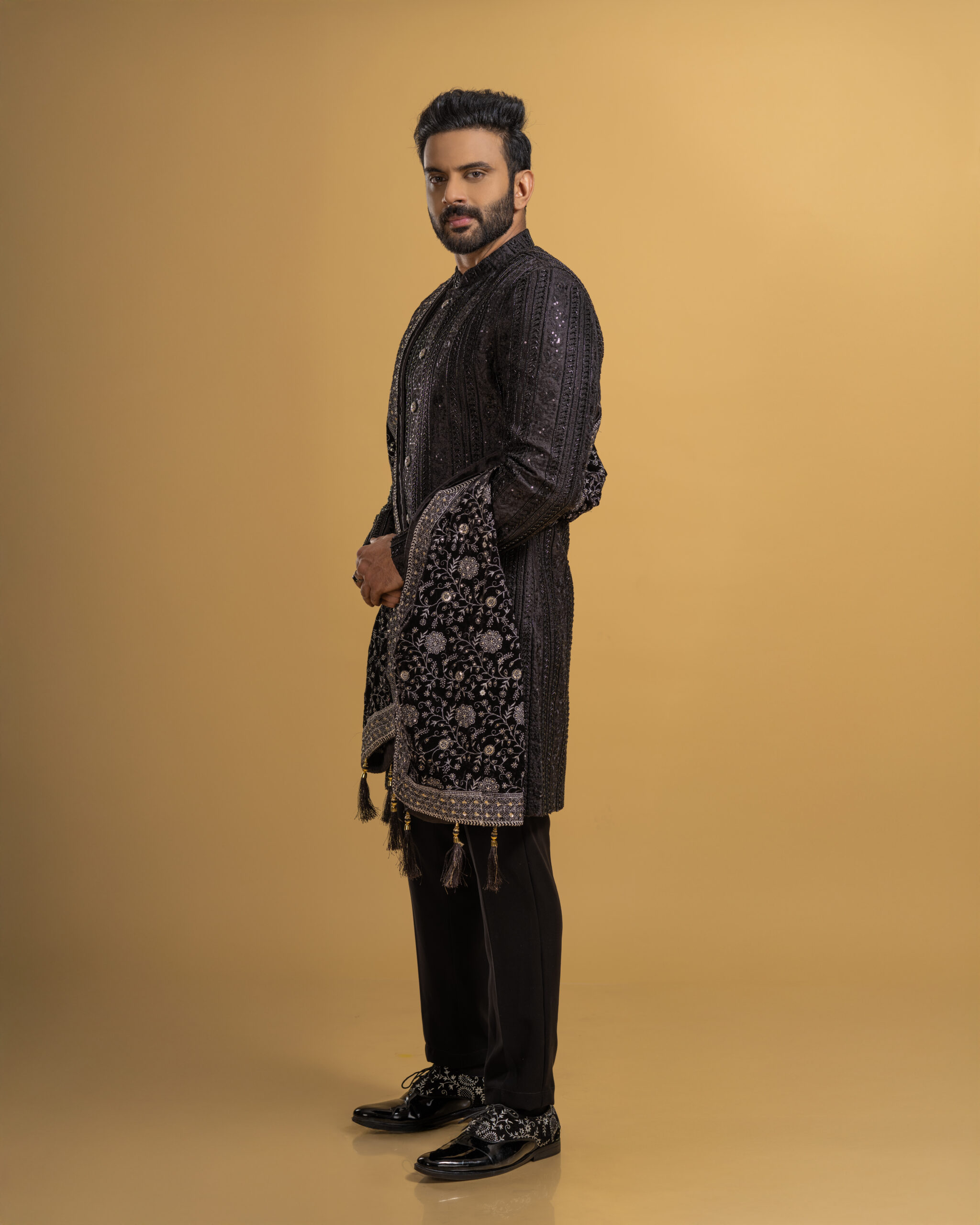 Absolutely! We offer a wide selection of matching accessories, including turbans, stoles, cufflinks, pocket squares, and footwear. Our team can help you coordinate everything for a complete wedding day look.